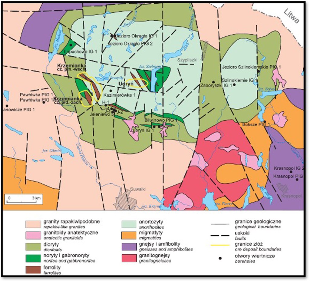 The Suwalki intrusion is part of a Anorthosite-Mangerite-Charnokite-Granite (Rapakivi) suite date circa 1.5 Ga. It was explored for Ti-V ores in the 2000s, encompassing geophysical surveys (magnetic, gravity, seismic) and more than 100 drill holes. The belt hosts a giant V-Ti oxide resource with more than 1500 Mt of ore at 0.3 wt% V2O5, 7 wt% TiO2 and 23 wt% Fe. The deposit is currently uneconomic due to its relatively low grade and thick cover (>500 m). However, the deposit could potentially become economic if the demand for V and Ti increases, especially considering that there is no active production of these two critical raw materials in the EU. In addition, the deposit contains Co, Ni and Sc as potential by-products. Moreover, the deposit has not been analysed for PGE, yet orthomagmatic Ti-V oxide deposits elsewhere are known to contain elevated PGE (Maier et al., 2003).