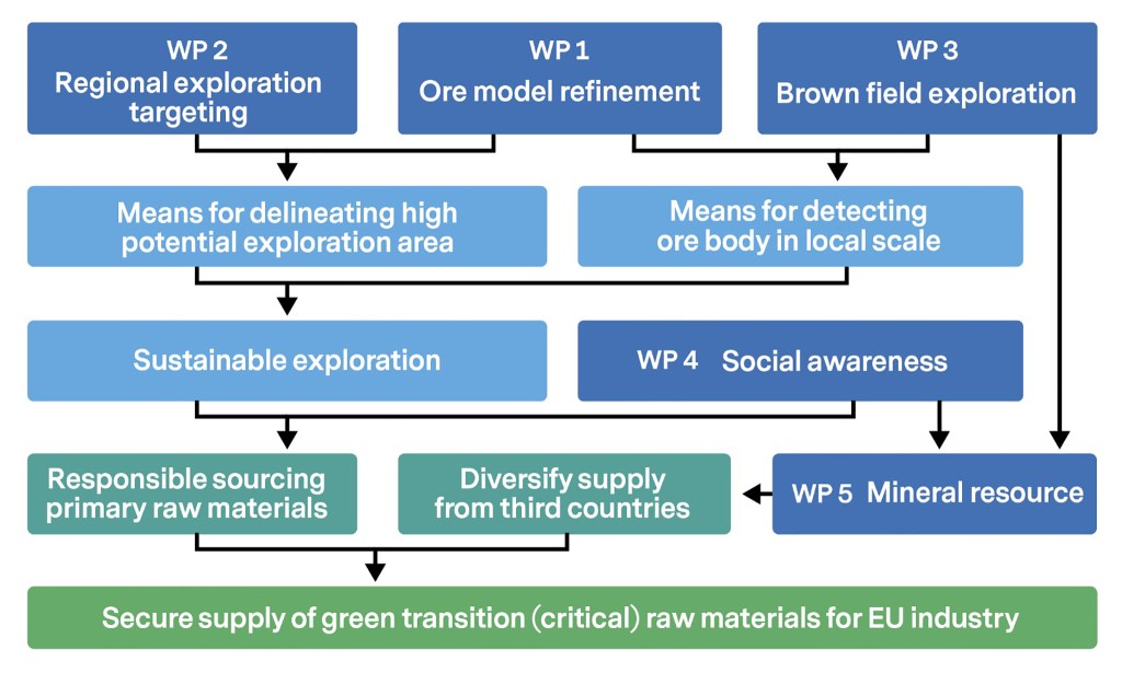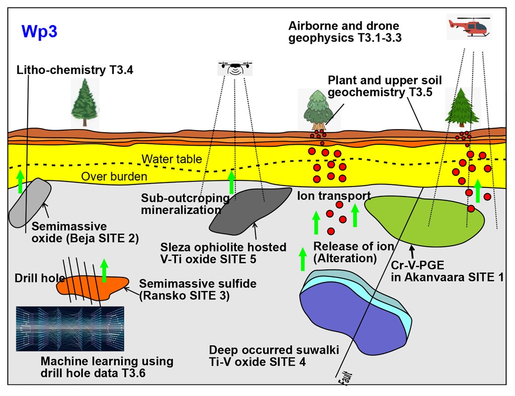 The objective of this WP is to develop a solution integrating different innovative methods together to vector towards a high potential area at the local deposit scale. The planned solution starts from litho-chemical modelling, followed by various geophysical methods depending on sub-ore types, and then by environmentally friendly surficial geochemistry (upper soil, plant chemistry), and 3D prospectivity modelling via machine learning method where intensive drill core data is available. 5 deposits from reference region sites will be studied which represent different sub-types.