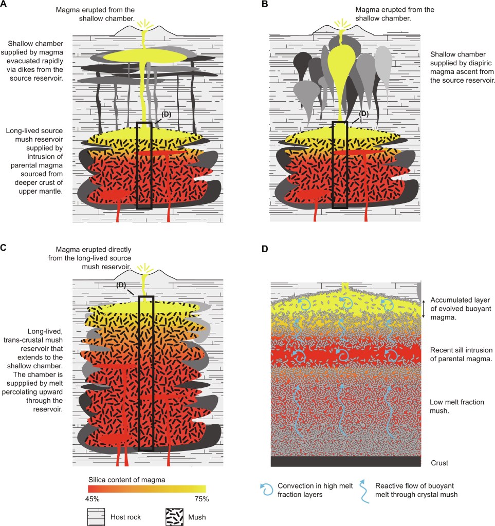 Results from this work suggest that the large amounts of magma involved in large-scale volcanic eruptions are accumulated in the deep crust rather than at shallow sub-volcanic depths. The release of these magmas to the cool upper crust is dictated by their buoyancy. When emplaced in shallow magmatic chambers, the eruptible silicic magmas must be quickly evacuated in order to generate large-scale eruptions; else these magmas cool to form plutons. Therefore, the largest and least frequent eruptions are a consequence of rapid segregation of magma from deep crustal reservoirs.